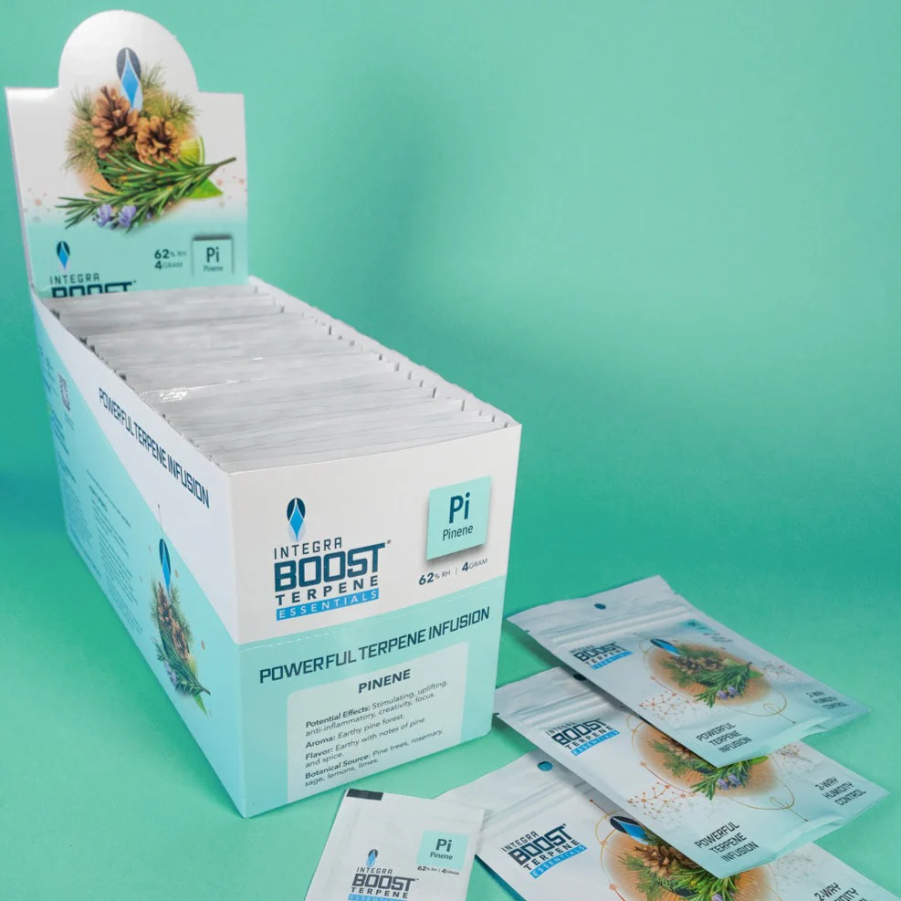 Each package of Integra Boost® Terpene Essentials contains patented salt-free, plant-based 2-way moisture control formula and terpene isolates derived from botanicals. All terpenes are tested, standardized in potency and certified safe terpenes.